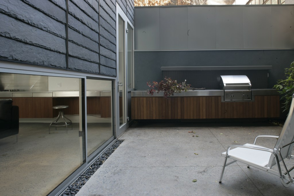 The 800-square-foot house is designed as a rental residence and sits behind the owner’s townhouse. The entrance is through a 15-foot-wide cobblestone alley, framed by a metal screen wall.