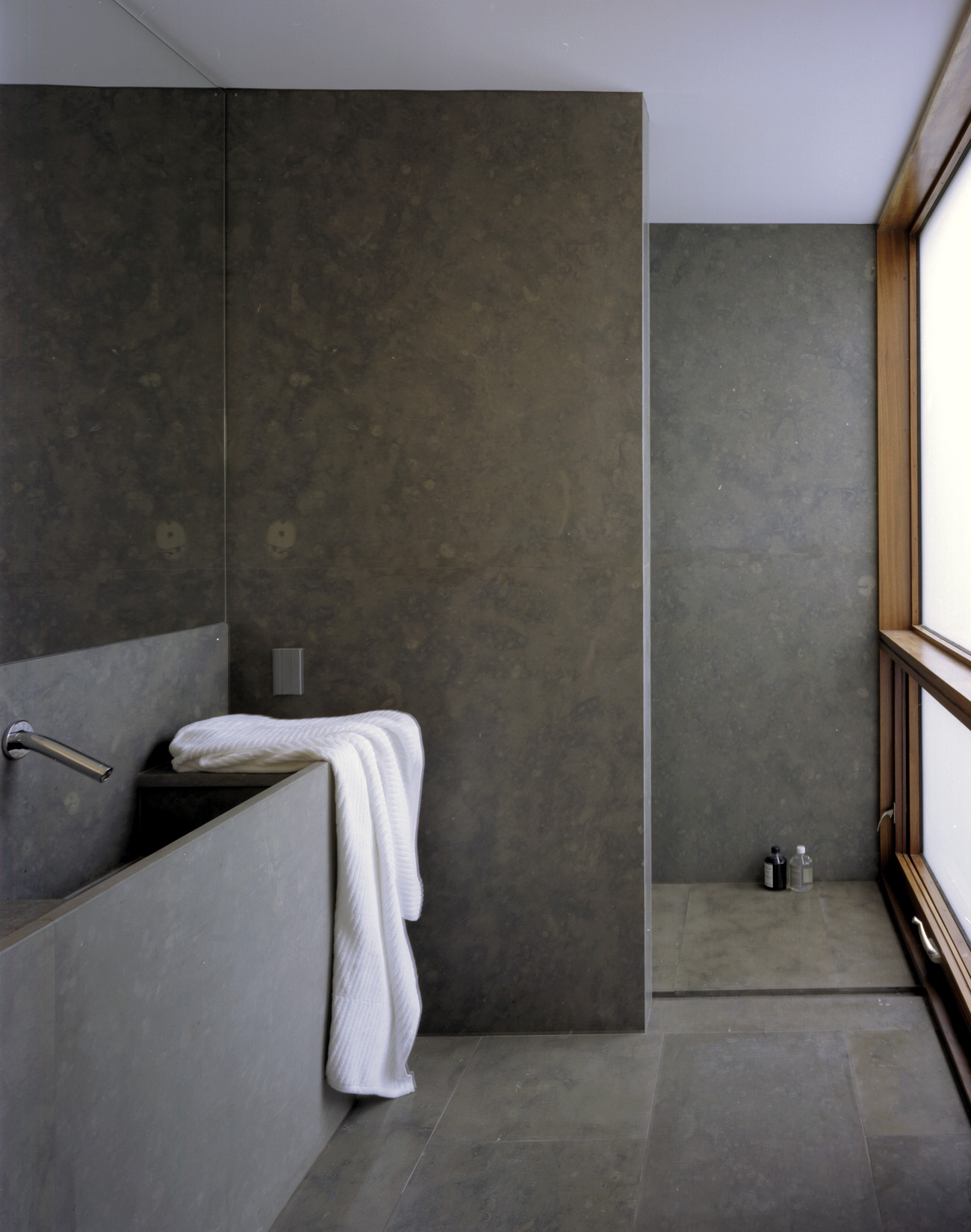 The material enclosure of a shower folds space into a conversation between wood, land, water and body.