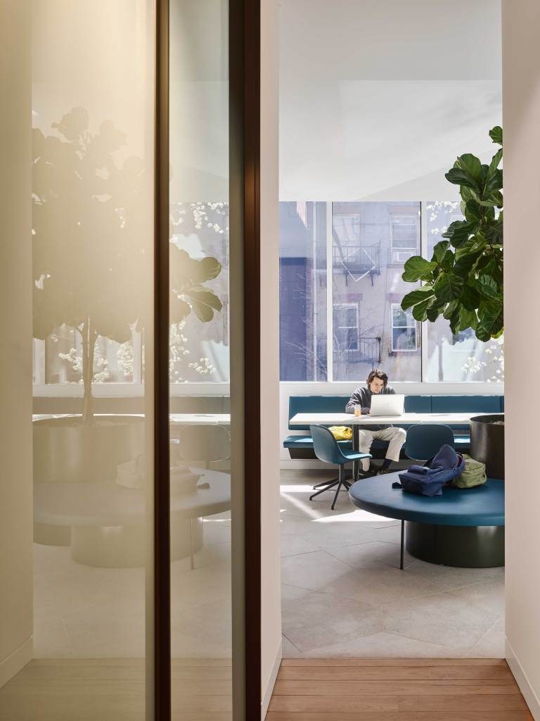 On the second floor, what was originally an unused rooftop was enclosed in fourteen foot tall, fire-rated glass panels, creating new space for a cafeteria and several additional offices. Green roofs and a large skylight top the new enclosure.