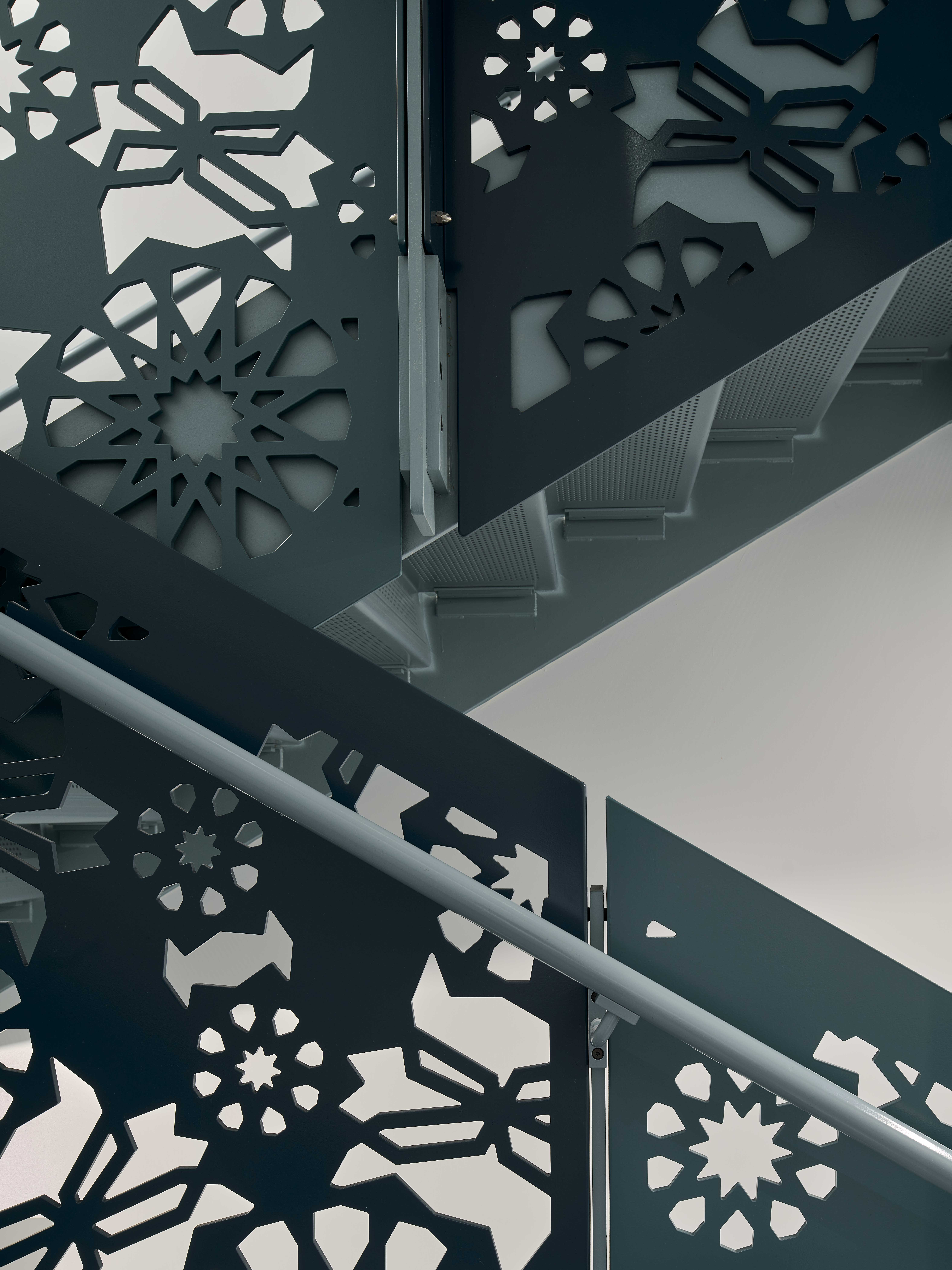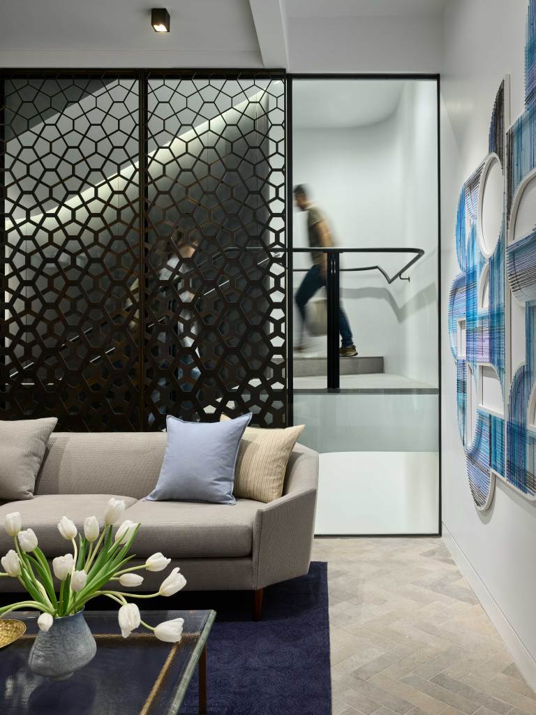 An ornamental stair rail seen through glass lends pattern and texture to the space
