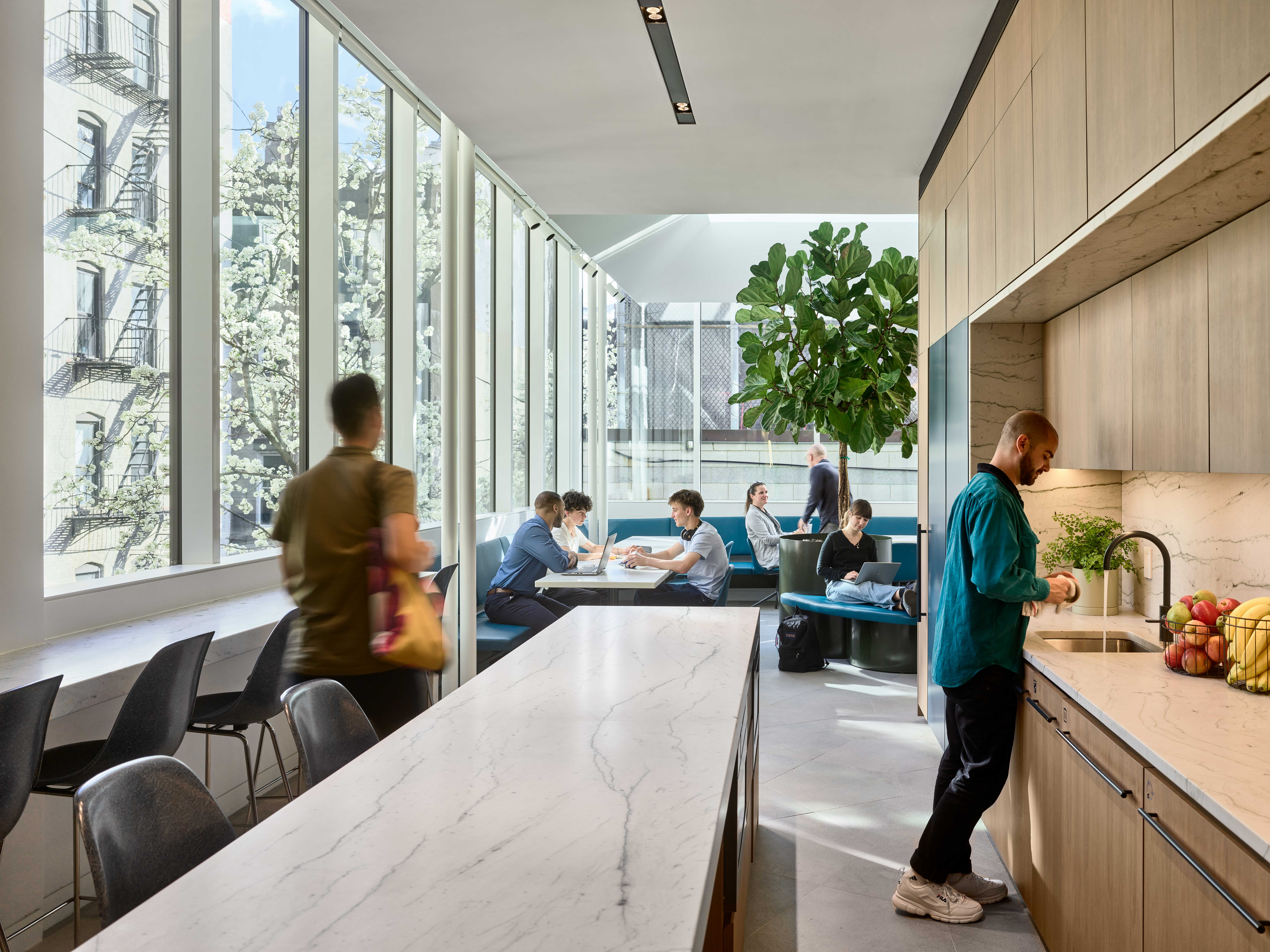 On the second floor, what was originally an unused rooftop was enclosed in fourteen foot tall, fire-rated glass panels, creating new space for a cafeteria and several additional offices. Green roofs and a large skylight top the new enclosure.